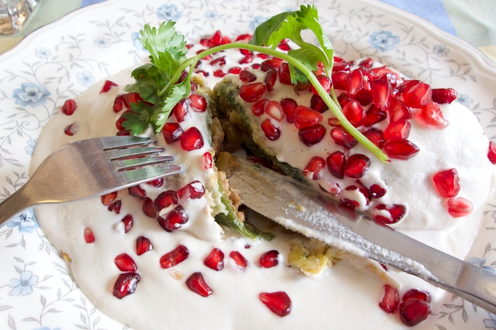 9月のメキシコは、独立記念日を迎え、街全体に祝賀ムードが漂っていた。メキシコシティ在住の友人とサン・アンヘルのメルカードにある食堂でこの時期ならではの、チレエンノガーダを久しぶりに食べる。大きなパプリカに似た唐辛子の肉詰に、胡桃の白いソースをかけ、赤いザクロの実とパセリを散らした見た目にも美しい料理で、この時期に食べるのである。