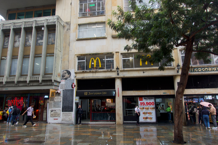 日が暮れかかってきたので、悲劇の政治家ホルヘ・ガイタンの写真と説明からなる大型本を買い求め、書店をあとにした。ガルシア=マルケスも通ったというカフェ・パサヘの前を通りすぎ、ウーゴに案内されて向かったのが、1948年にボゴタソすなわちボゴタ暴動が起きるきっかけになった、当時自由党の大統領候補だったガイタンの暗殺事件の現場だった。