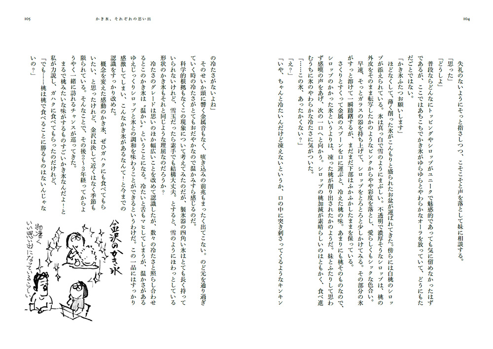 もっと家庭的な章を選ぶかと思いましたが、そうきましたか。私は「かき氷、それぞれの思い出」ですかね。カミさんが、「金沢のかき氷が美味しかったから、ガハクにも食べさせたい」なんて珍しく殊勝なことを言っていて。金沢の店を贔屓にするあまり、近所にあるすごい行列のかき氷屋に誘って行ってみたときも、金沢の比ではないと後までずっと言ってましたね。挿画では、金沢のかき氷を思い浮かべて「美味しかった」という表情のカミさんを描いたのですが、水を凍らせただけのものに、ここまでにこにこしちゃってるのが何やら不憫で。この表情は気に入ってます。キラキラがひとつ私の頭にズボッと刺さってますけどね。
