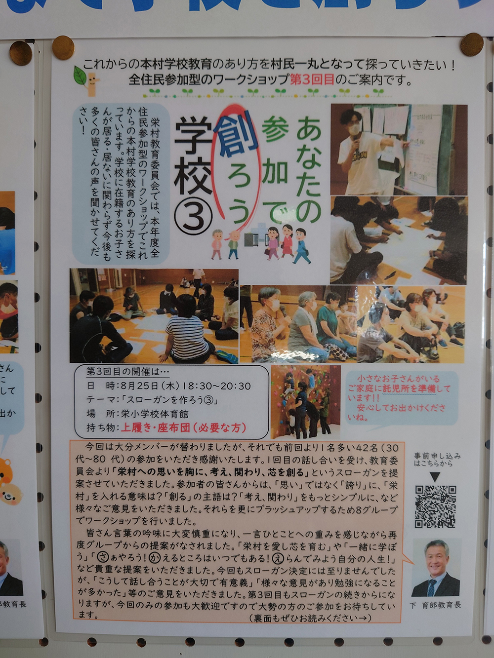「栄村教育委員会では昨年度から小中のあり方を検討してきましたが、本年度は全住民参加型のワークショップ(5人で1グループ)で、これからの本村学校教育のあり方を村民一丸となって探っていきたいと思います。あなたの声を、今後の学校や村の教育に反映していくチャンスです。学校に在籍するお子さんが居る・居ないにかかわらず、多くの皆さんの声を聞かせてください!」