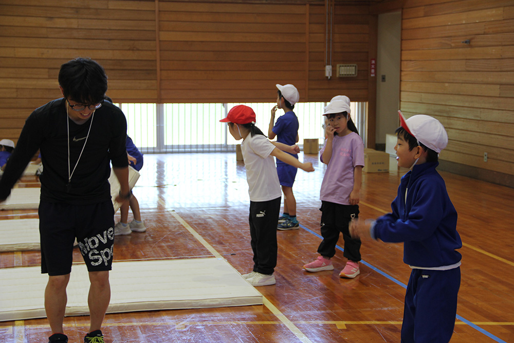 体育館では10人ほどの小学1、2年生が、マット運動を行っていた。みんなそれぞれ、Tシャツにジャージだったり、短パンだったり、揃いの運動着は着ていない。楽しそうに、思い思いにチャレンジする姿を、若い教員がやさしく見守っている。