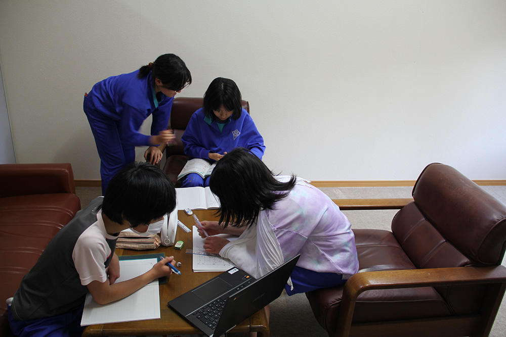 小学6年生12人は算数の授業中だったが、教室にいる子が驚くほど少ない。どの子も、好きな場所で課題に取り組んでいるのだ。女子たち4人は相談室のソファーで、女子会状態。パソコンと教科書を開いて、お互いに教え合っている。