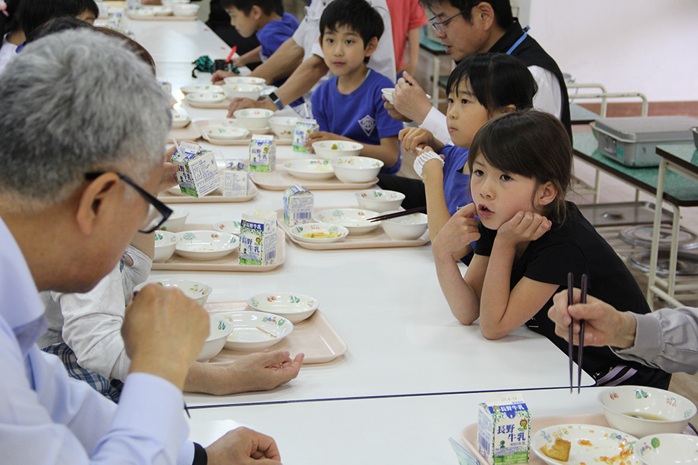 給食はランチルームに小学生47名、中学生19名、そして校長先生はじめ先生たち全員が一堂に会して、みんなで食べる。いろんな「いただきます」が響き合う空間が、心地良い。供されるのは地産地消を意識した、自校調理によるあたたかな食事だ。