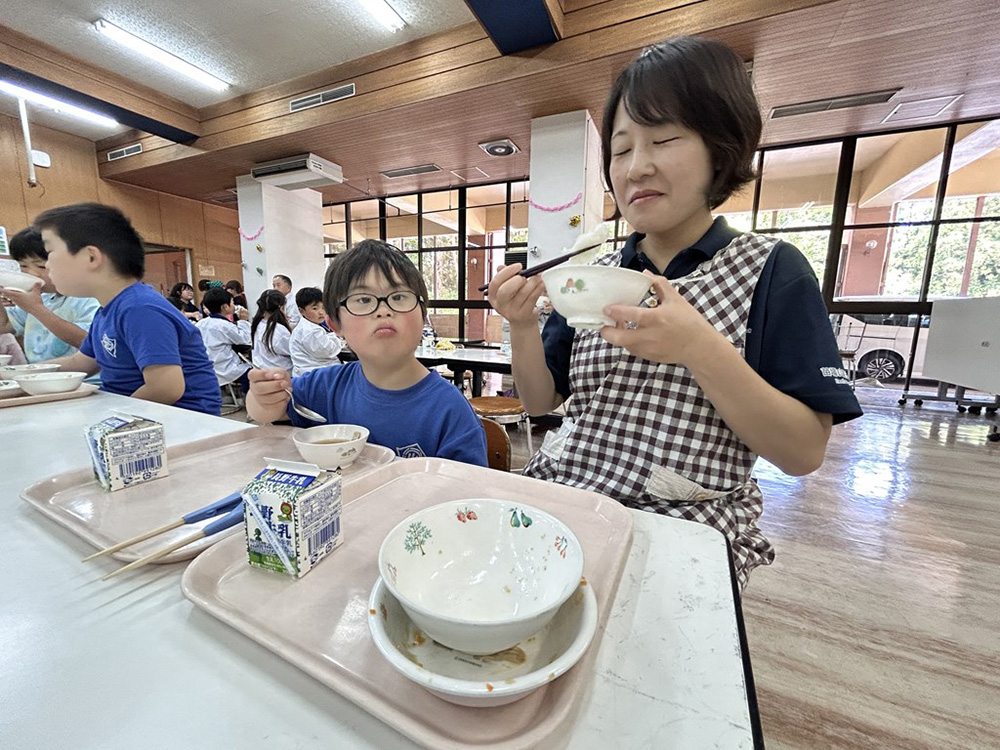 給食の時間、晴大くんはランチルームでみんなと一緒だ-