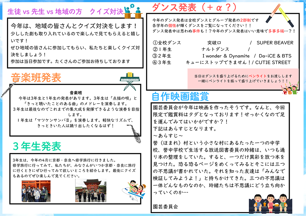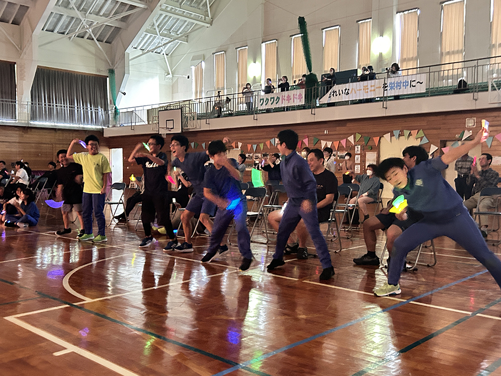 生徒たちが作ったプログラムには、イベントが5つ組み込まれた。「音楽班の発表」、「教員VS生徒VS地域の人クイズ対決」、「3年生発表」、「ダンス➕α」、「自作映画鑑賞」と盛り沢山の内容を、7人の3年生が中心となって、全校生徒19名で作り上げるのだ。