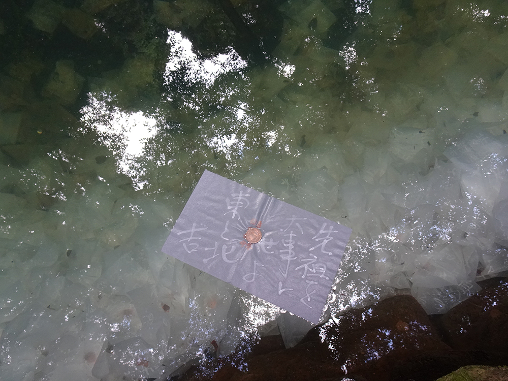和紙の上に硬貨をのせて、池底に沈むまでの時間と沈む場所によって縁を占う-