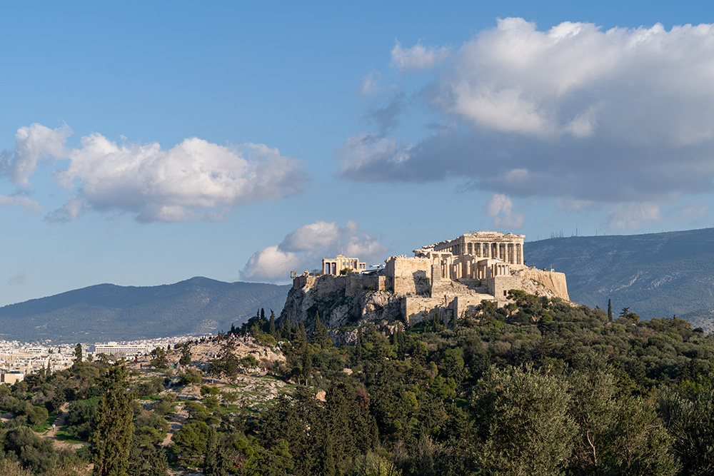 アクロポリスに建つパルテノン神殿。アクロポリスとは、「高い丘にある都市」を意味する。アテネのアクロポリスがもっとも有名で、女神アテナに捧げられたパルテノン神殿やディオニュソス劇場などがある。アテネの町は、このアクロポリスを中心に広がる。写真はアクロポリスを正面に見ることのできるフィロパポスの丘から撮影。