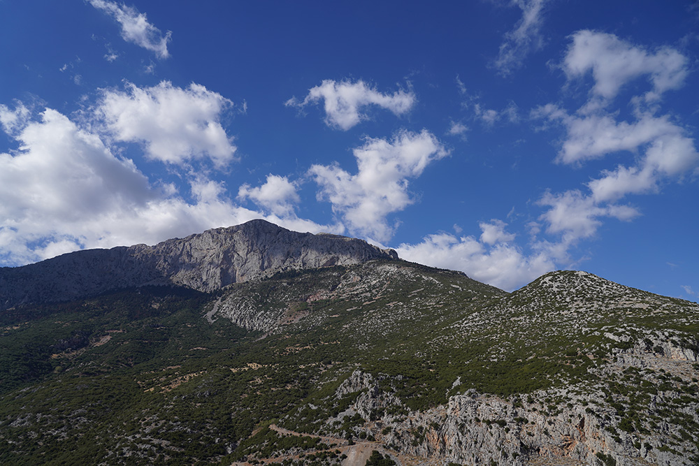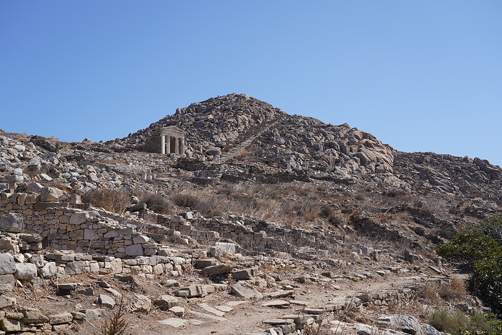 キュントス山。それほど高い山ではないが、乾燥した石が転がる坂道は、想像以上に危険。思わず足に力が入る。それでも、山頂から見下ろすと、そこには遺跡とエーゲ海が広がっている。