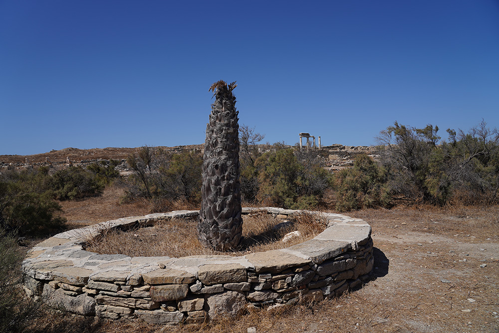 レトが双子を生んだ場所とされる聖なる湖は、現在は水が枯れ、草が生えている。そこには、後年神話にちなんでシュロの木が植えられた。
