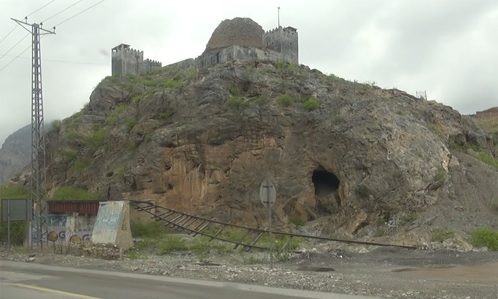 車が川を越えて山懐に入ると道は上り坂に変わる。つづら折れの道路を、身体を右に左に揺られて上っていく。右手の丘の上に赤みを帯びた石積みの城壁が長く、まっすぐ延びていた。車窓にへばりついてビデオを回していると、助手席のカシンさんが後ろを向いて、