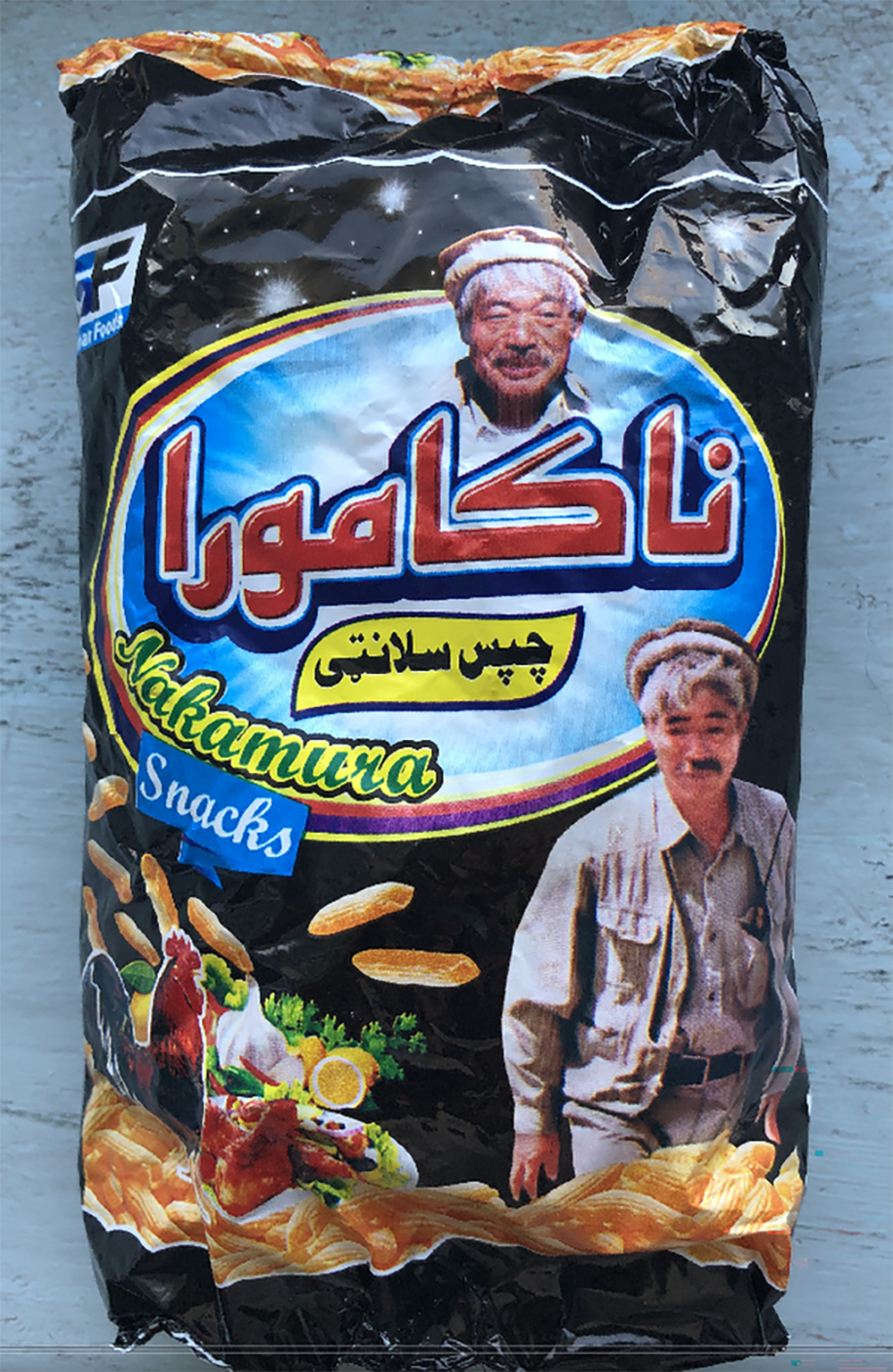 なんと黒色のパッケージに平たいパコール帽を頭にのせた中村さんの顔写真と、作業着姿のイラストかプリントされている。そして、堂々と〈Nakamura Snacks(ナカムラ・スナック)〉とアルファベットでも商品名を表記して売られていたのだ。値段は15アフガニ(約25円)。〈SALMAN FOODS(サルマン・フーズ)〉という食品メーカーが製造・販売している。