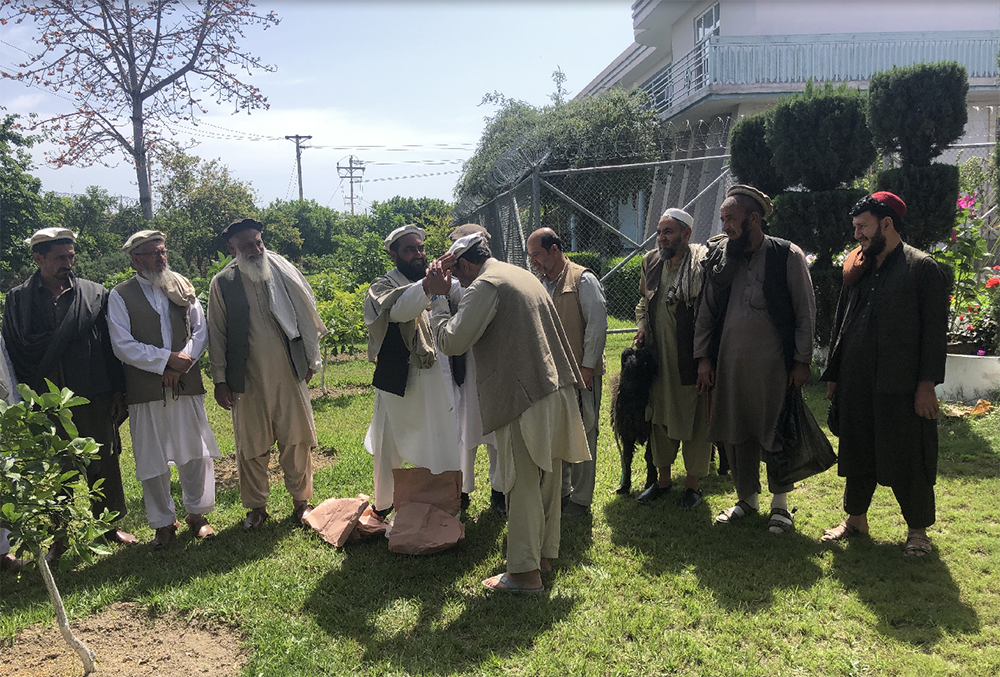 コット渓谷の村々の長老たちは、「用水路建設の御礼を」と遠路はるばるジャララバードのPMS事務所にやってきた。右から三番目の男性が連れている黒い羊は、彼らの心づくしの贈り物。(2023年4月10日 筆者撮影)