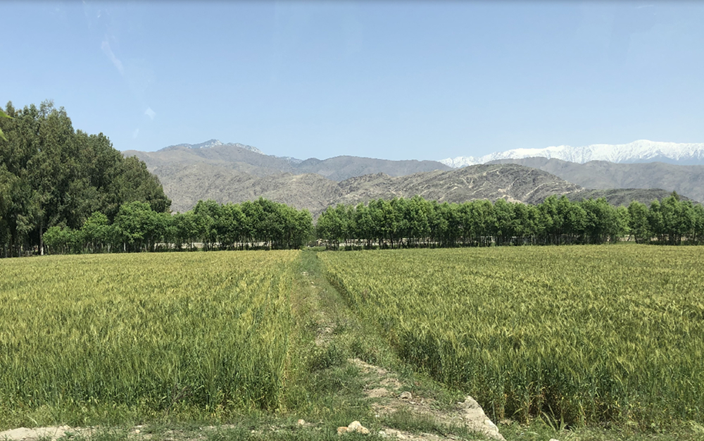 小麦畑の向こうの防砂林は、ガズの並木が途中で終わり、その先から丈の低いユーカリが北へ一直線に連なっている。防砂林の向こうには荒涼とした岩山が横たわり、さらにその奥に氷雪をまとった4000メートル級のケシュマンド山脈がそそり立っていた。