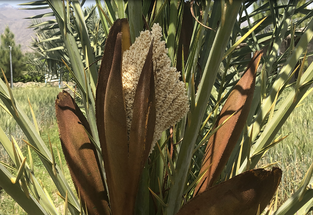 ナツメヤシの雄花。花粉を雌花にかける人工授粉は、紀元前数千年前のメソポタミア文明の時代からおこなわれていたという。(2023年4月11日 著者撮影)