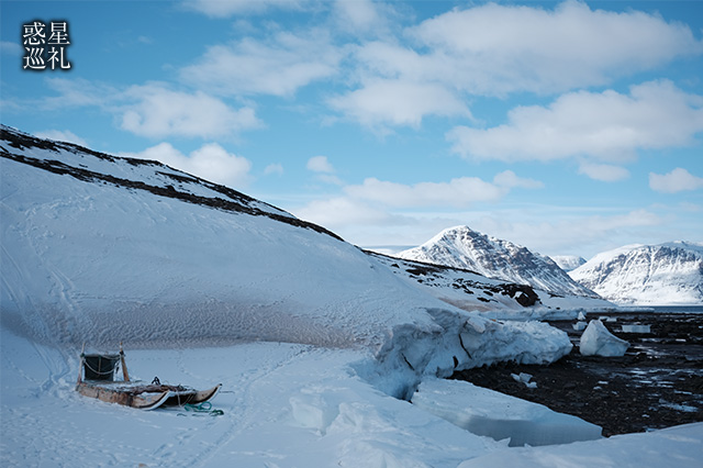 最後の氷河の入口にさしかかり、村があるフィヨルド内を一望したとき、私は息をのんだ。いつもなら全面的に海氷がのこる時期であるが、今年は九割がた流れてしまっており、水色の海原が広がっている。海は南太平洋の楽園のように透き通った淡い水色で、それが白き山々にかこまれた風景は荘厳なほどの美を現出しているが、その美しさを堪能する余裕は私にはなく、この状況で村にもどれるのか? という不安で必死にルートを探した。