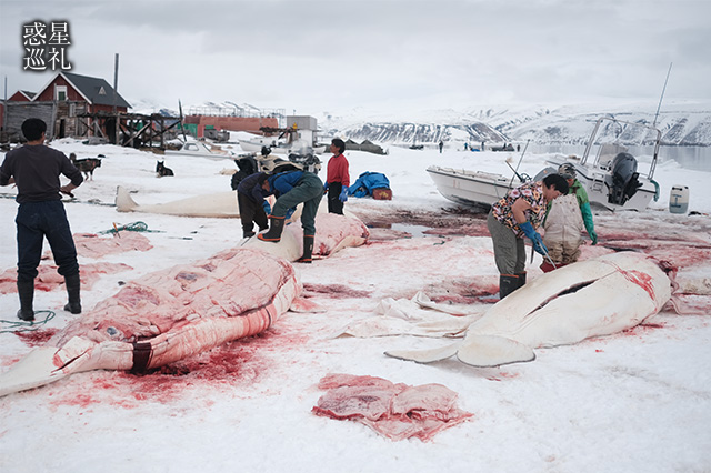 日本にもどる数日前に4頭のシロイルカが獲れて大猟となった。村にもどってから大量の海象(セイウチ)やシロイルカの肉をもらっていたので、私も大きなナイフをふるって解体の手伝いにくわわった。シロイルカ級の大物になると皮や肉をざくざくと切っていくだけなので、技術的なむずかしさは逆になくなる。